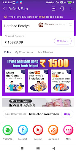 इसमें आपका Withdraw या Recharge कही भी नही अटकने वाला यह एकदम Safe & Secure Game है। इसमें आपको Refur & Earn का 30 प्रतिशत Commission मिलने वाला है।